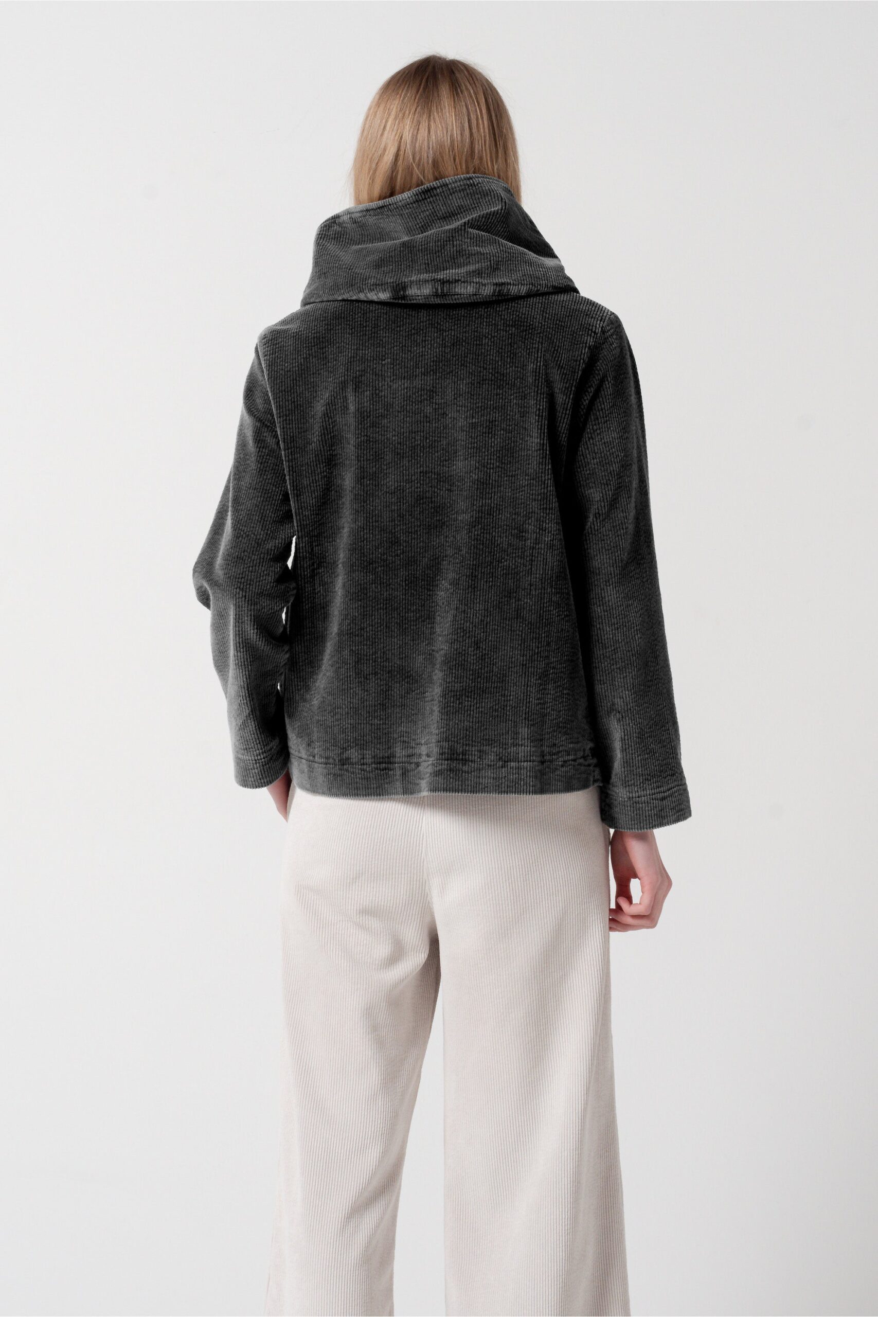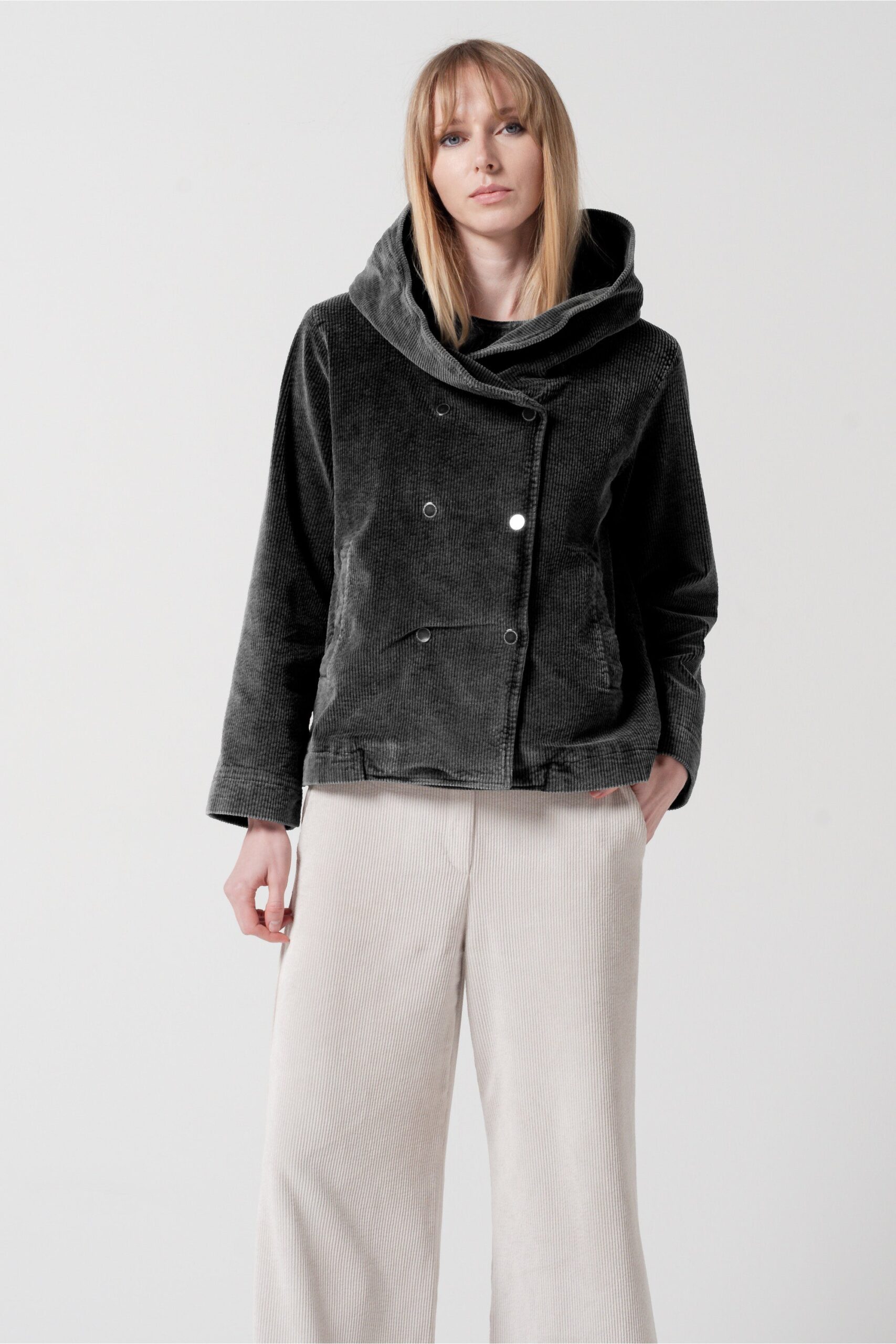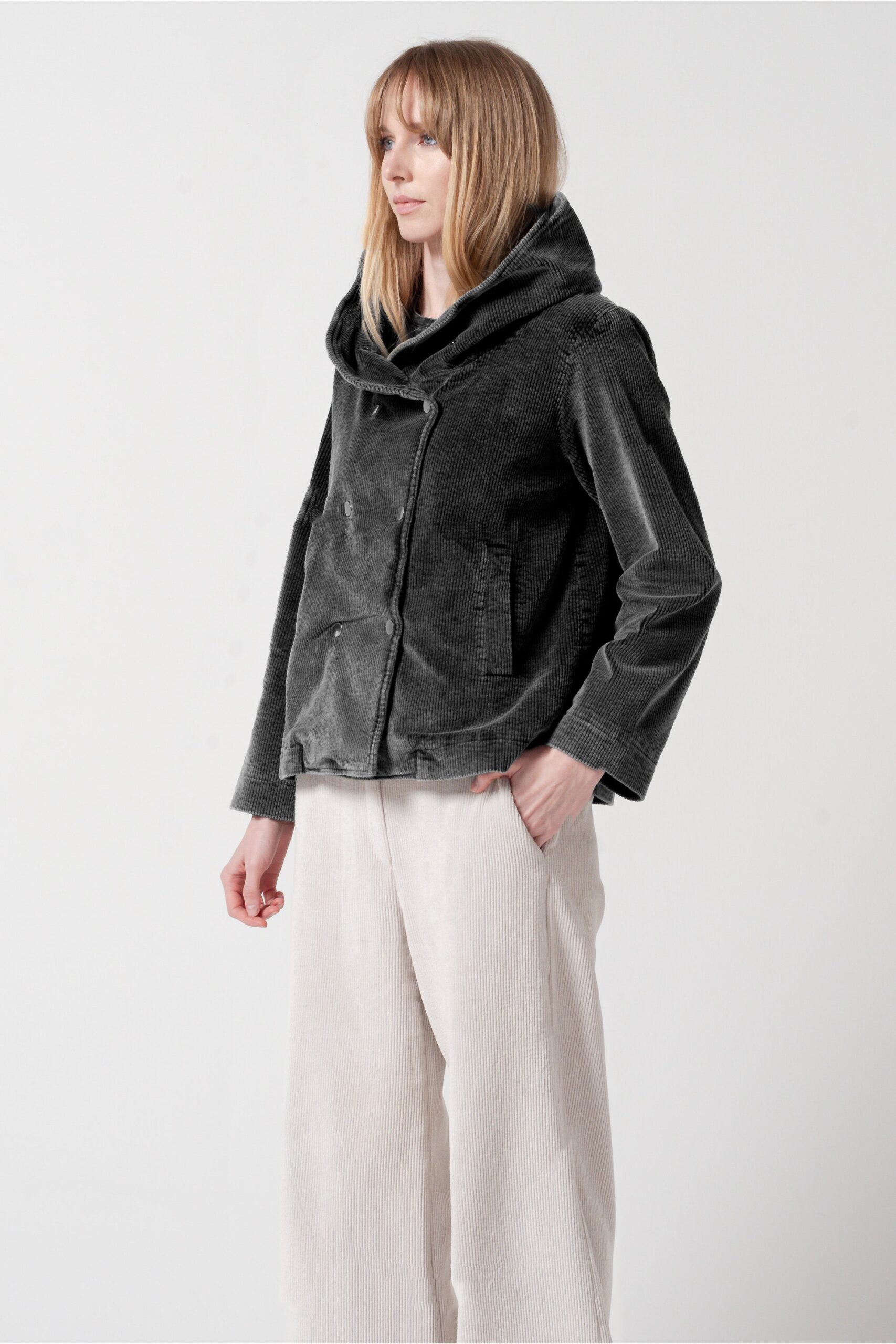 Regular fit jacket made from corduroy cotton. Features a hooded collar and long sleeves. The jacket is spray painted for color.
